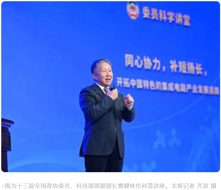“芯片問題是事關(guān)百年發(fā)展的長(zhǎng)期戰(zhàn)略問題,不是短期應(yīng)急問題,必須持之以恒去發(fā)展。”“要充分發(fā)揮制度優(yōu)勢(shì),集中優(yōu)勢(shì)隊(duì)伍持續(xù)攻關(guān)。”“要敢于開辟新賽道,打造新生態(tài),推進(jìn)‘再全球化’。”……9月25日下午,寬敞明亮的全國(guó)政協(xié)禮堂里,十三屆全國(guó)政協(xié)委員、教科衛(wèi)體委員會(huì)副主任曹健林正站在舞臺(tái)中央巨大的顯示屏前,以“同心協(xié)力,補(bǔ)短揚(yáng)長(zhǎng),開拓中國(guó)特色的集成電路產(chǎn)業(yè)發(fā)展道路”為題,為坐在臺(tái)下的全國(guó)政協(xié)委員、地方政協(xié)委員、高校學(xué)生、科研工作者等700余名觀眾作科普講座。