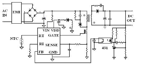 •主要特點(diǎn):專有頻率變換技術(shù),提高EMI性能。外部可編程PWM開關(guān)頻率。電流感測(cè)輸入的前沿消隱。內(nèi)部同步坡度補(bǔ)償。擴(kuò)展突發(fā)模式控制,提高效率和最小備用電源設(shè)計(jì)。低VDD啟動(dòng)電流和低工作電流。門箝位輸出最大電壓18V。逐周期限流,內(nèi)置自適應(yīng)電流峰值調(diào)節(jié)。開機(jī)軟啟動(dòng),可編程CV和CC調(diào)節(jié)。電壓欠鎖滯(UVLO),OVP,OCP,OLP,箝位VDD。