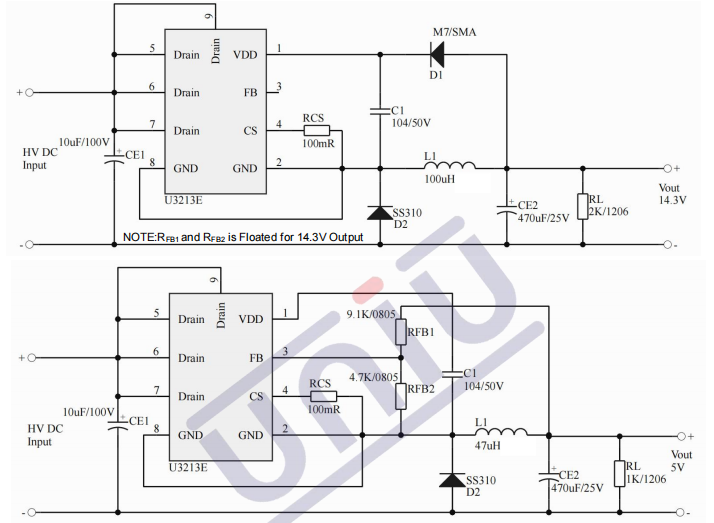 •主要特點:集成5A 200V MOS/;集成200V高壓啟動電路;多模式控制、無異音工作;支持降壓和升降壓拓撲;默認14.3V輸出(FB腳懸空);待機功耗低于50mw;良好的線性調整率和負載調整率;集成軟啟動電路;內部保護功能:過載保護(OLP);逐周期電流限制(OCP);輸出過壓保護(OVP);VDD過壓、欠壓和電壓箝位保護