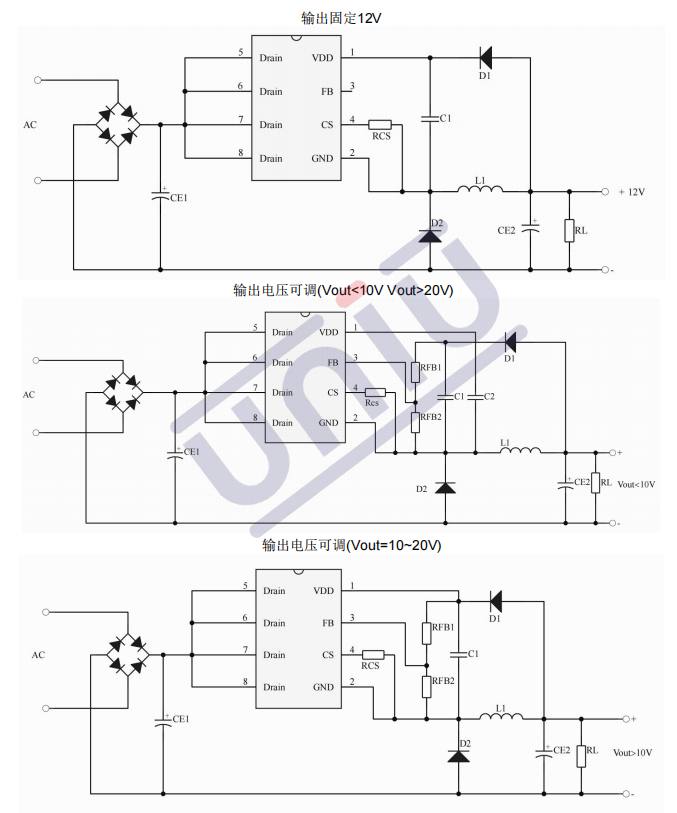 •主要特點(diǎn):集成 500V 高壓?jiǎn)?dòng)電路;多模式控制、無異音工作;支持降壓和升降壓拓?fù)?默認(rèn) 12V 輸出( FB 腳懸空);待機(jī)功耗低于 50mW;良好的線性調(diào)整率和負(fù)載調(diào)整率;集成軟啟動(dòng)電路;內(nèi)部保護(hù)功能 :過載保護(hù) (OLP);逐周期電流限制 (OCP);輸出過壓保護(hù) (OVP);VDD 過壓、欠壓和電壓箝位保護(hù)