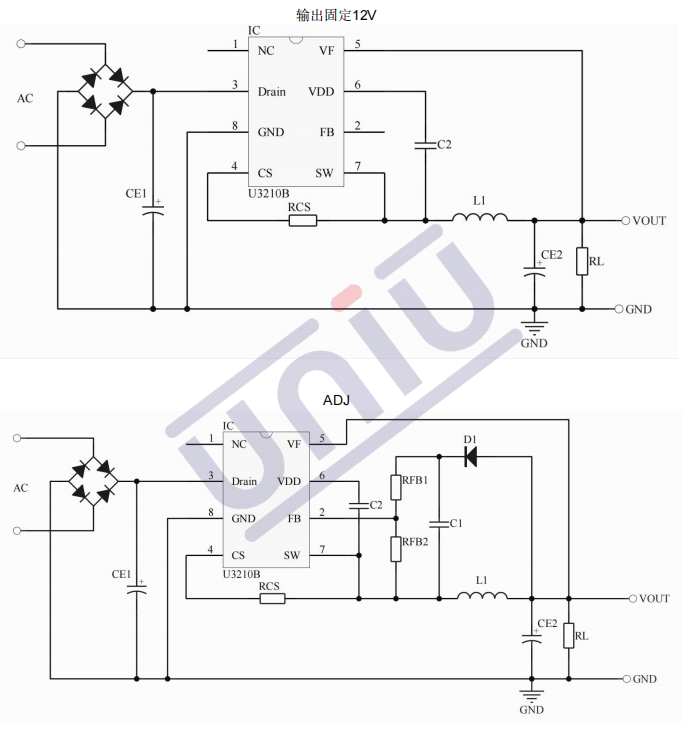 •主要特點(diǎn):集成9Ω,500V MOS ; 集成500V 高壓?jiǎn)?dòng)電路 ; 集成續(xù)流二極管 ; 多模式控制、無(wú)異音工作 ; 支持降壓和升降壓拓?fù)?/span> ; 默認(rèn)12V 輸出( FB 腳懸空) ; 待機(jī)功耗低于50mW ; 良好的線性調(diào)整率和負(fù)載調(diào)整率 ; 集成軟啟動(dòng)電路 ; 內(nèi)部保護(hù)功能:過(guò)載保護(hù) (OLP) 、 逐周期電流限制 (OCP) 、 輸出過(guò)壓保護(hù) (OVP) 、 VDD 過(guò)壓、欠壓和電壓箝位保護(hù)