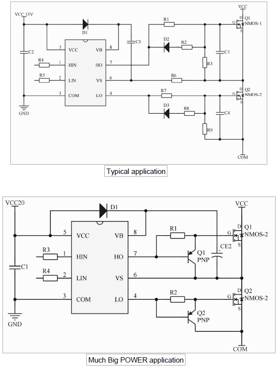 •主要特點(diǎn):可完全工作到+600V,可耐受負(fù)瞬態(tài)電壓,抗v /dt,柵極驅(qū)動(dòng)供電范圍從5到20V,欠壓鎖定,3.3V, 5V和15V輸入邏輯兼容,兩個(gè)通道的傳播延遲匹配。